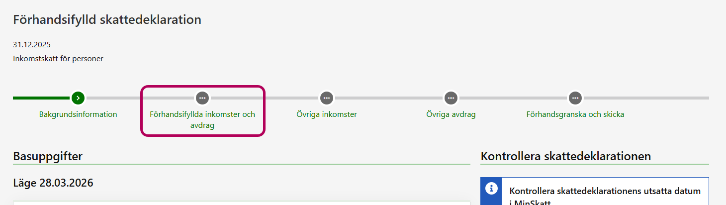 Välj i sektionen Inkomstskatt för personer i punkten Förhandsifylld skattedeklaration 2025 länken Kontrollera den förhandsifyllda skattedeklarationen.