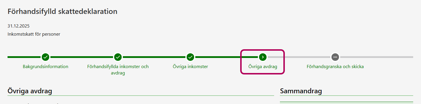 Kontrollera att de förhandsifyllda inkomsterna och avdragen är rätt.