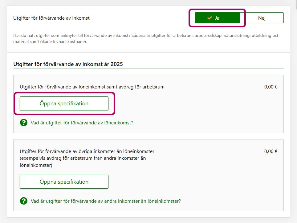 Välj Ja i punkten Utgifter för förvärvande av inkomst.