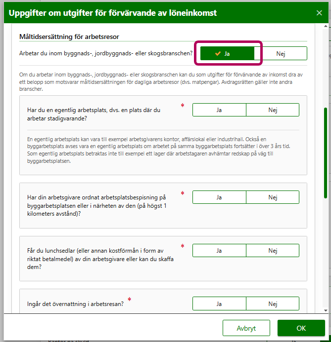 Rulla sidan nedåt till punkten Måltidsersättning för arbetsresor och svara Ja om du arbetar inom byggnadsbranschen, jordbyggnadsbranschen eller skogsbranschen. Avdragsrätten gäller inte andra branscher.