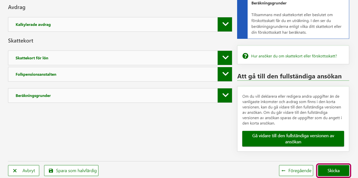 - Om du vill fortsätta med att fylla i senare ska du välja knappen Spara som halvfärdig. Uppgifterna bevaras sparade i en månad. Skatteförvaltningen behandlar inte uppgifterna innan du skickat dem.