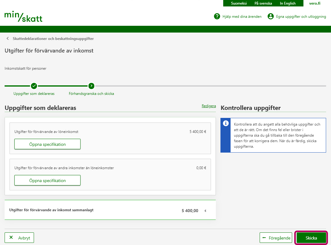 Observera att endast utgifter för förvärvande av löneinkomster överförs till den förhandsifyllda skattedeklarationen. Utgifter för förvärvande av andra inkomster än löneinkomster måste du ange på nytt när du får den förhandsifyllda skattedeklarationen.