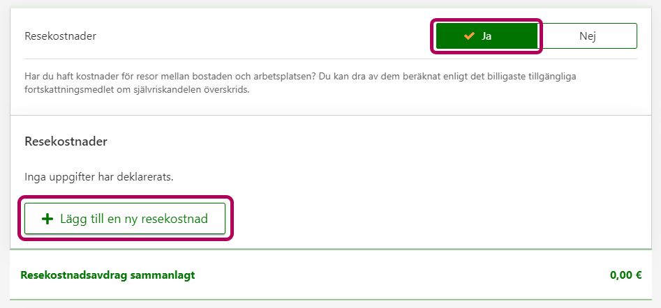 I annat fall ska du gå till fasen Övriga avdrag. Välj först Ja i punkten Resekostnader och därefter knappen Lägg till en ny resekostnad.