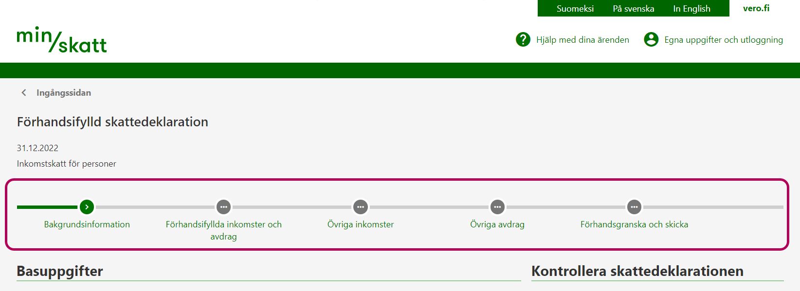 Om du har lämnat uppgiften om hushållsavdrag tidigare, till exempel i din ansökan om skattekort eller förskottsskatt, visas den i fasen Förhandsifyllda inkomster och avdrag. Korrigera uppgifter i den här fasen. Uppgifterna visas förhandsifyllda också om du har kommit överens om att företaget som utförde arbetet anmäler uppgifterna för dig.