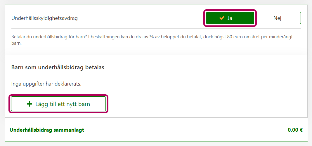 Om du har angett underhållsskyldighetsavdraget tidigare, till exempel i din ansökan om skattekort eller förskottsskatt, visas det i fasen Förhandsifyllda inkomster och avdrag. Korrigera uppgifterna i den här fasen.