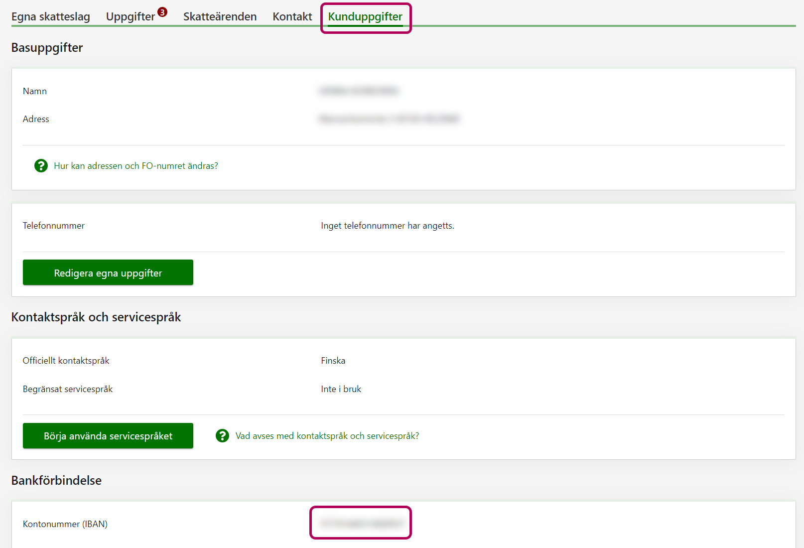 När du anmäler kontonumret i MinSkatt uppdateras det genast i Skatteförvaltningens uppgifter. Du kan inte anmäla kontonumret per telefon.