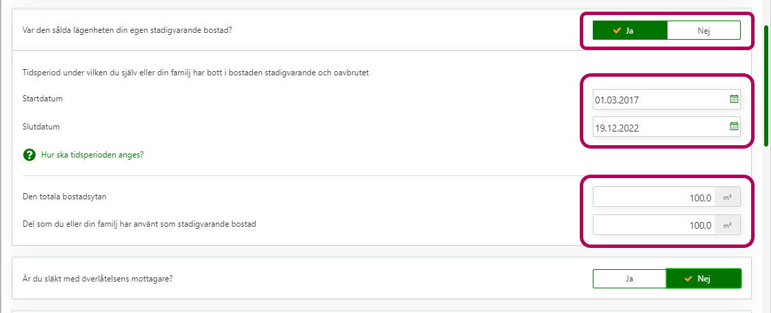 - Om du har sålt din andel i sin helhet ska du svara Ja i punkten Har du sålt hela bostaden?
