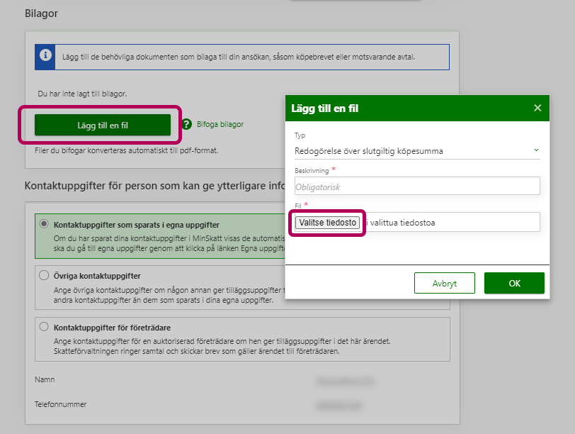 Bifoga köpebrevet eller ett motsvarande avtal och andra handlingar som behövs via knappen Lägg till en fil.