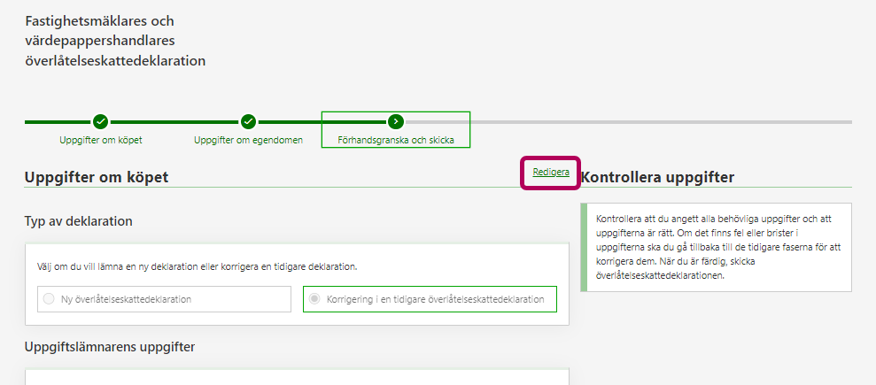 Kontrollera uppgifterna i överlåtelseskattedeklarationen. Vid behov kan du ännu redigera uppgifter via länken Redigera. När alla uppgifter är rätt ska du välja knappen Skicka.