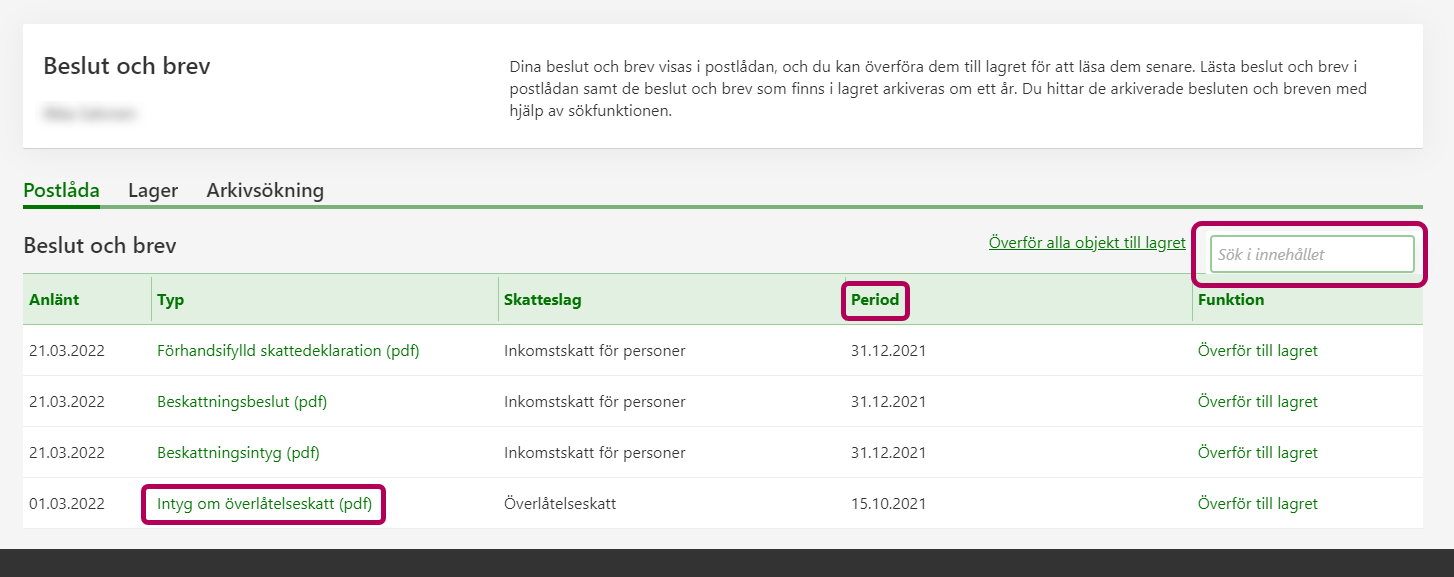 Om du har fått flera intyg om överlåtelseskatt känner du igen dem från datumet för köpet. Datumet för köpet visas under Period.