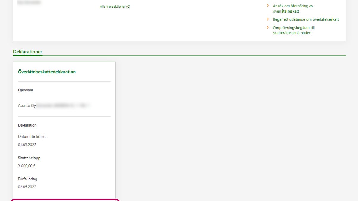 På sidan Överlåtelseskatt visas alla de överlåtelseskattedeklarationer som du lämnat. Välj den deklaration som hänför sig till intyget du behöver. Välj knappen Öppna deklaration.