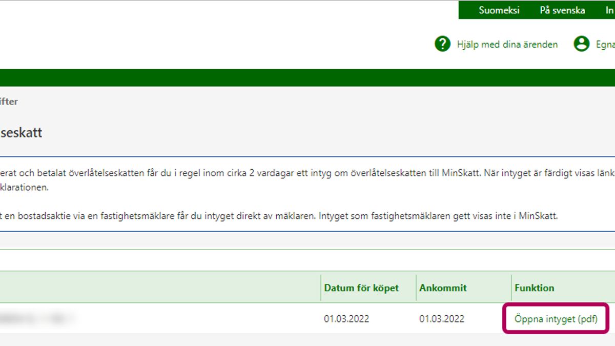 När intyget är färdigt kan du öppna det via uppgifterna om överlåtelseskatt eller i postlådan. Om någon överlåtelseskatt inte visas på fliken Egna skatteslag ska du logga in i MinSkatt på nytt. Om du har lämnat överlåtelseskattedeklarationen på en pappersblankett ska du vänta på att intyget om överlåtelseskatt visas i MinSkatt.