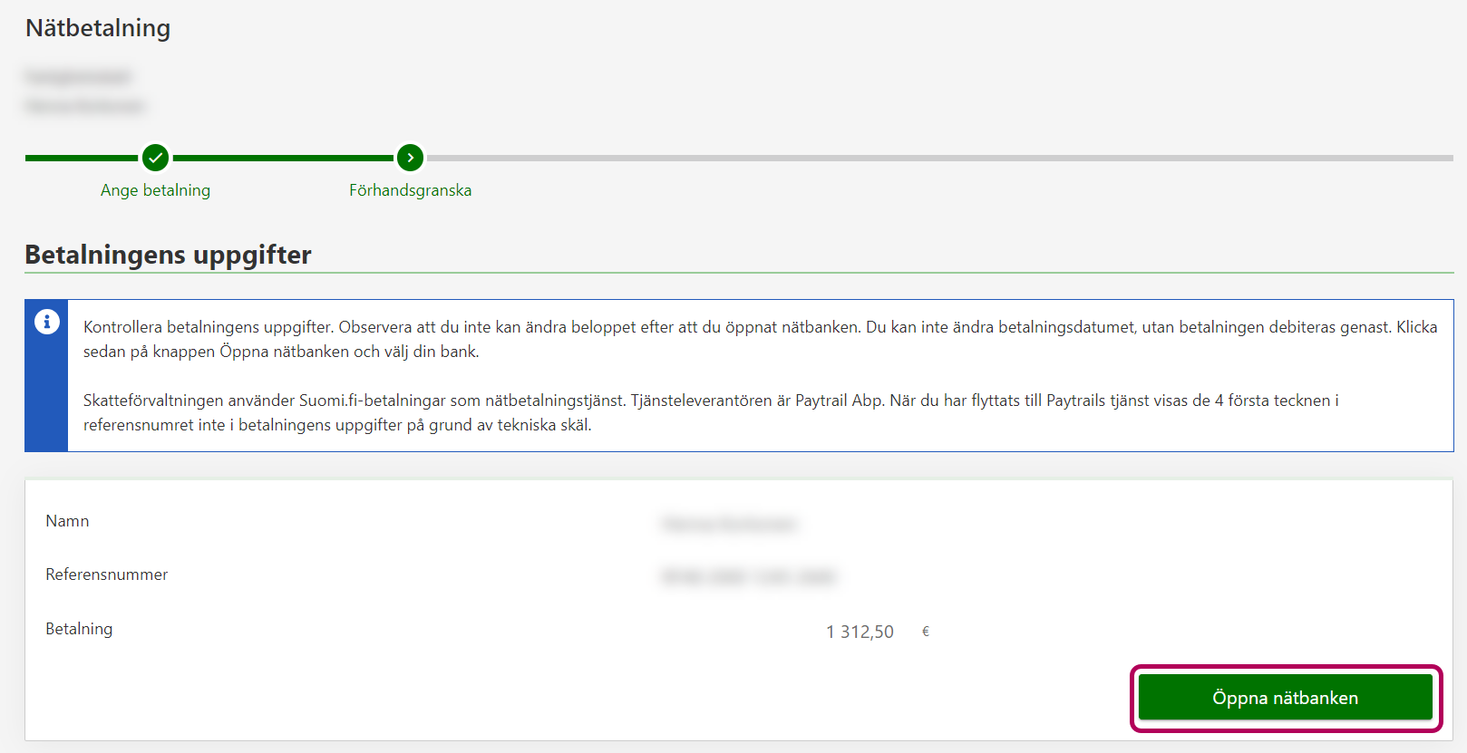 Kontrollera uppgifterna om betalningen och gå till din nätbank via knappen Öppna nätbanken.