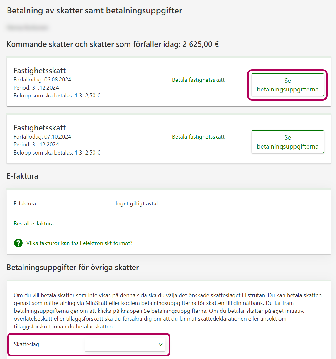 Om du vill betala skatter som inte visas på sidan ska du gå till punkten Betalningsuppgifter för alla skatter och välja det önskade skatteslaget.