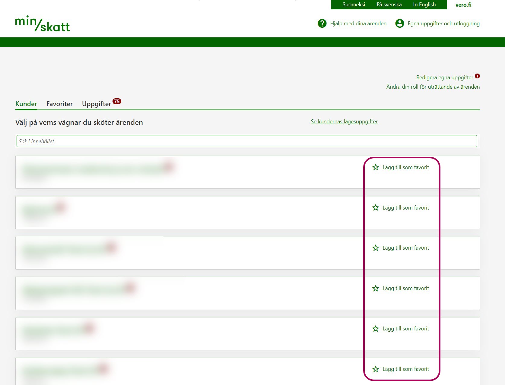 Klicka på stjärnikonen vid de kunder som du vill lägga till i dina favoriter. Du kan välja högst 300 kunder till dina favoriter.