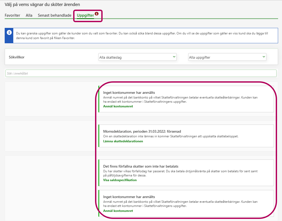 Om du har lagt till favoriter ser du alla öppna uppgifter i dina favoriter som en lista på fliken Uppgifter. Exempelvis via länken i uppgiften "Det finns förfallna skatter som inte har betalats” kommer du direkt till kundens saldospecifikation.