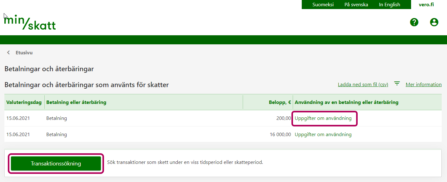 Via knappen Transaktionssökning kan du söka transaktioner under en viss tidsperiod eller skatteperiod.