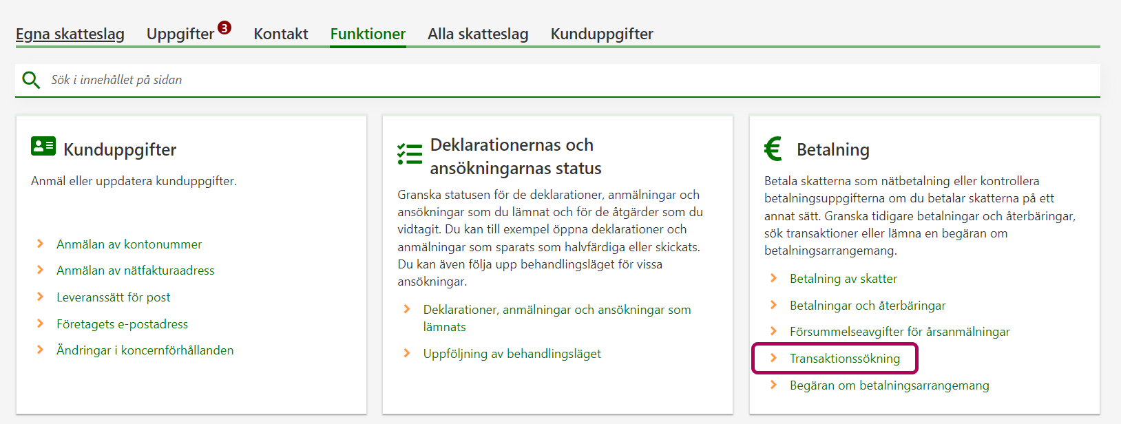I MinSkatt kan du söka och granska transaktioner som gäller olika skatteslag. Du kan avgränsa sökresultaten med lämpliga sökvillkor.