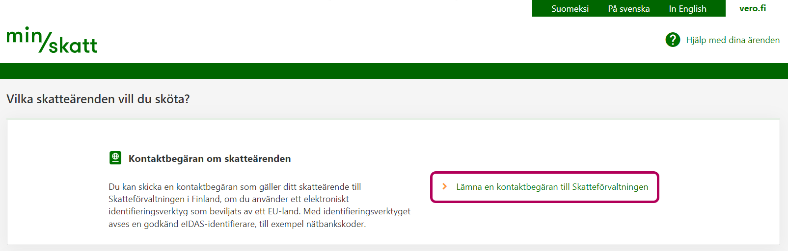 Som medborgare i ett EU-land kan du inleda ditt skatteärende elektroniskt i Finland genom att fylla i en kontaktblankett i MinSkatt.