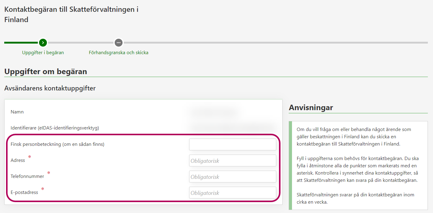Du får en bekräftelse på att Skatteförvaltningen har tagit emot din kontaktbegäran. Vi svarar på din kontaktbegäran inom cirka en vecka. Observera att du inte kan redigera eller komplettera din begäran efter att du skickat den.