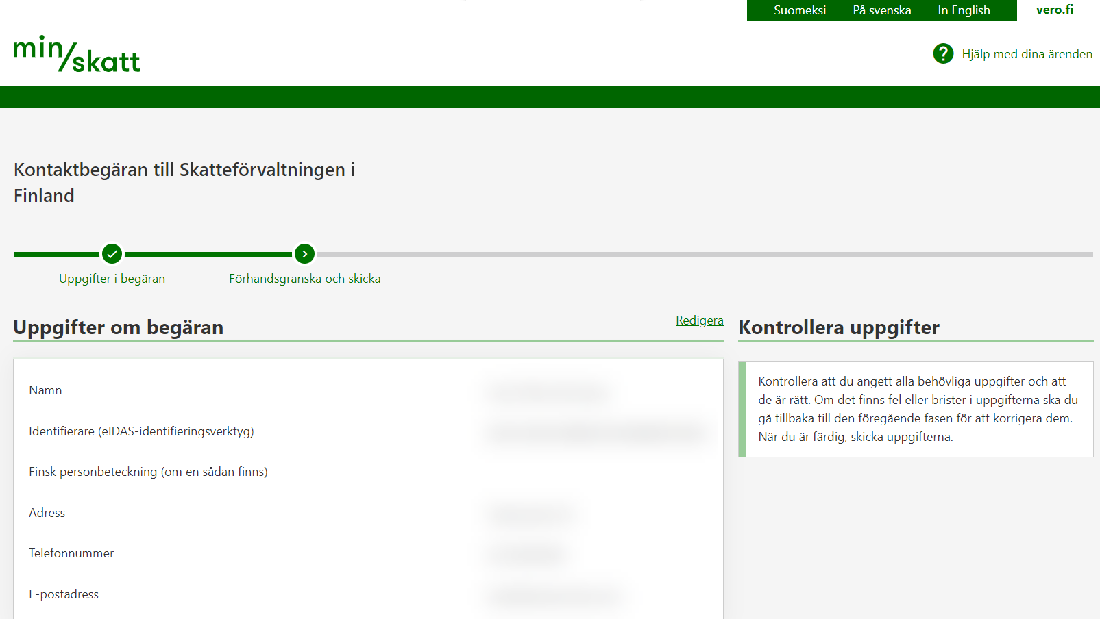 Du får en bekräftelse på att Skatteförvaltningen har tagit emot din kontaktbegäran. Vi svarar på din kontaktbegäran inom cirka en vecka. Observera att du inte kan redigera eller komplettera din begäran efter att du skickat den.