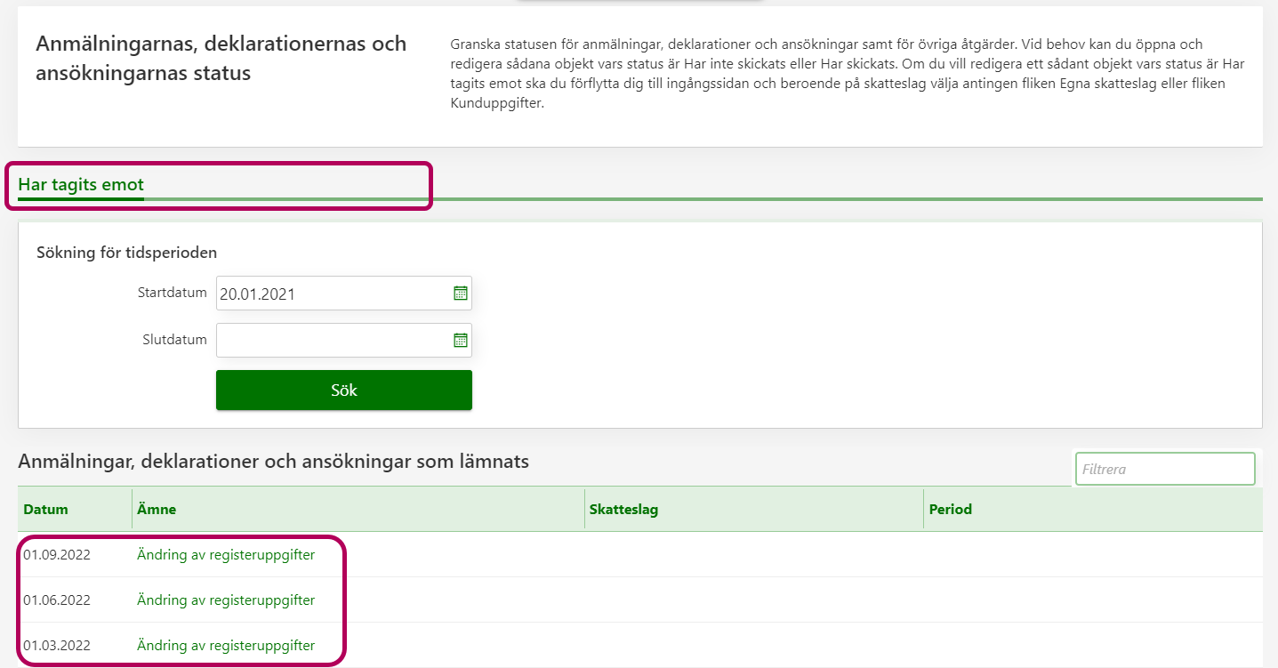 På fliken Har tagits emot ser du de deklarationer, anmälningar och ansökningar som du har lämnat inom 12 månader. Om dessa är över 12 månader gamla hittar du dem endast genom att använda sökfunktionen.