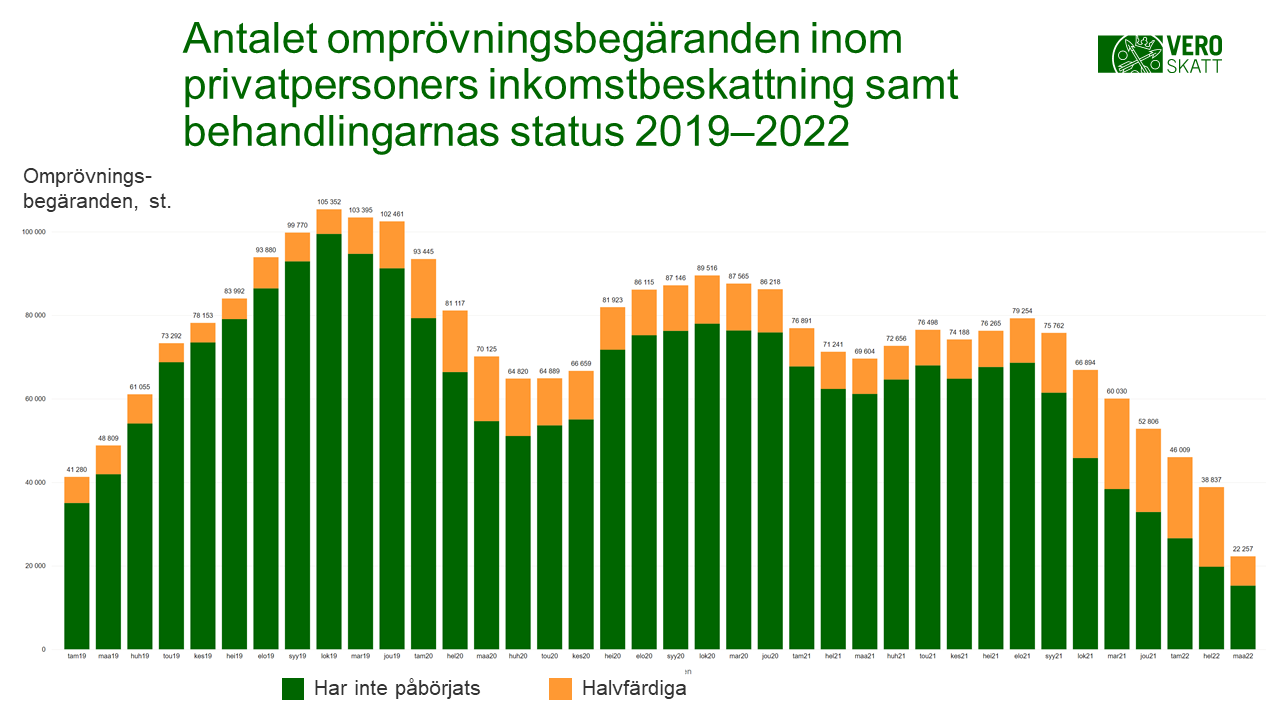 – Behandlingstiderna är fortfarande inte tillräckligt korta. Flera av de omprövningsbegäranden som fortfarande är under behandling är svårare fall vars behandling kräver till exempel kunnande som anknyter till internationell beskattning. För att det ska finnas tid för dessa svårare fall önskar vi att privatpersoner kommer ihåg att göra avdrag och andra korrigeringar i den förhandsifyllda skattedeklarationen i tid nu i maj, fortsätter Kyrö.