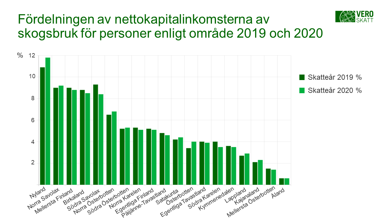 År 2020 fick personer vars hemkommun låg i Nyland största delen av kapitalinkomsterna av skogsbruk (11,8 %).
