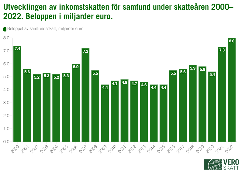 Företag och andra organisationer betalade allt som allt 8 miljarder euro i samfundsskatt, vilket är hela 10,1 procent mer än året innan. Det är det största nominella beloppet någonsin.