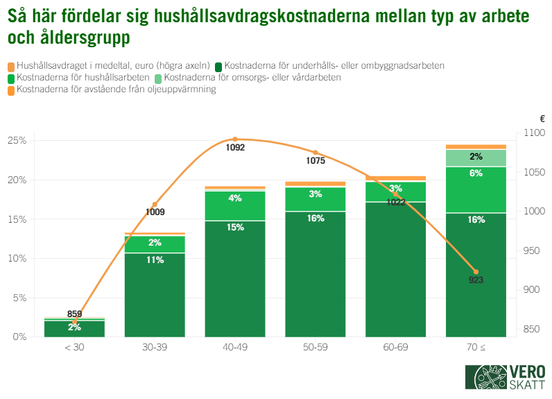 I det stora hela är det de äldre åldersgrupperna som utnyttjar hushållsavdraget oftare än andra. Kostnader för underhålls- och ombyggnadsarbeten och också för hushållsarbeten är de kostnader som dras av mest i alla åldersgrupper.