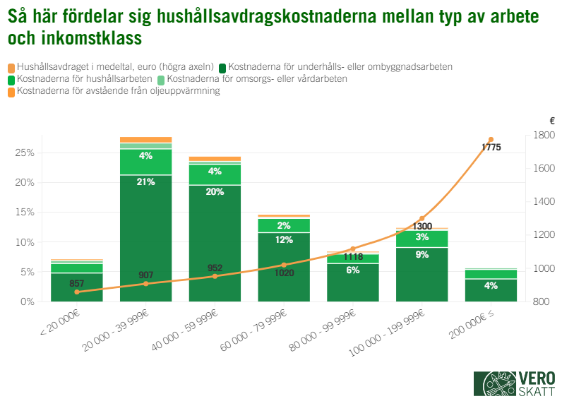 De genomsnittliga hushållsavdragen skiljer sig mellan olika inkomstklasser. Personer som tjänat mer än 200 000 euro gjorde i genomsnitt hushållsavdrag på 1 775 euro medan de som tjänat mindre än 20 000 euro gjorde avdrag på 857 euro.