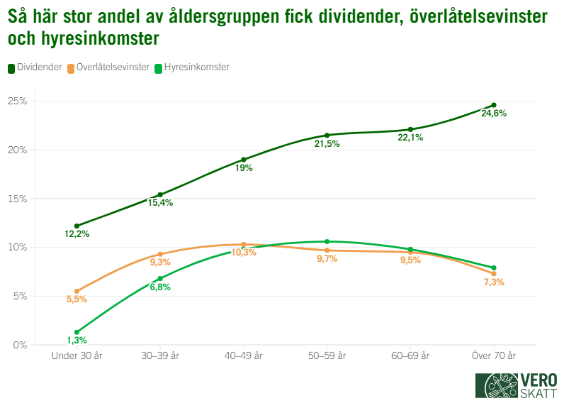 Det är typiskt äldre åldersklasser som får dividendinkomster: var fjärde över 70-åring fick dividendinkomster medan cirka en femtedel av 40–69-åringarna fick dividendinkomster. De största dividendinkomsterna fick 50–59-åringar, i genomsnitt 10 760 euro år 2022.