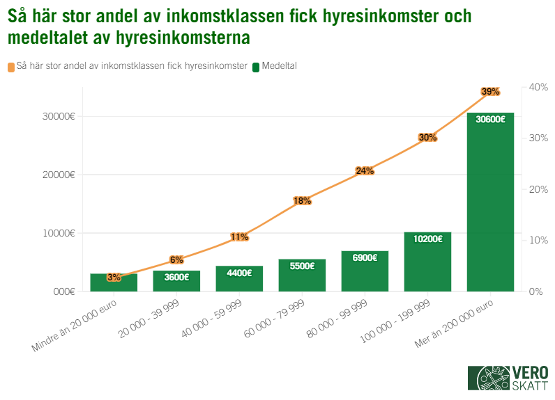 Höginkomsttagare får betydligt mer hyresinkomster än personer i andra inkomstklasser. Av dem som tjänade mer än 200 000 euro under året fick 39 procent hyresinkomster i fjol. Dessa hyresinkomster uppgick till lite mer än 30 000 euro i medeltal.