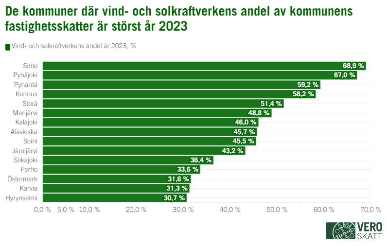 Mest fastighetsskatter av vind- och solkraftverk fick kommunen Simo (68,9 % av kommunens fastighetsskatter), Pyhäjoki (67 %), Pyhäntä (59,2 %) och Kannus (58,2 %).