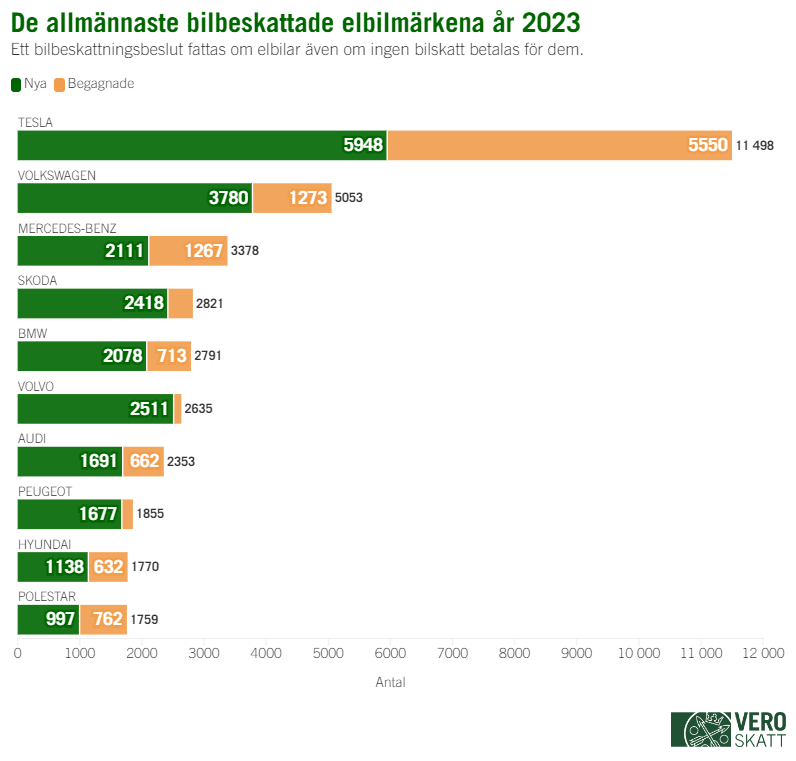 Av elfordonen var de allmännaste märkena Tesla (25,3 %), Volkswagen (11,1 %) och Mercedes-Benz (7,4 %). Cirka hälften av Teslorna var nya och hälften begagnade.