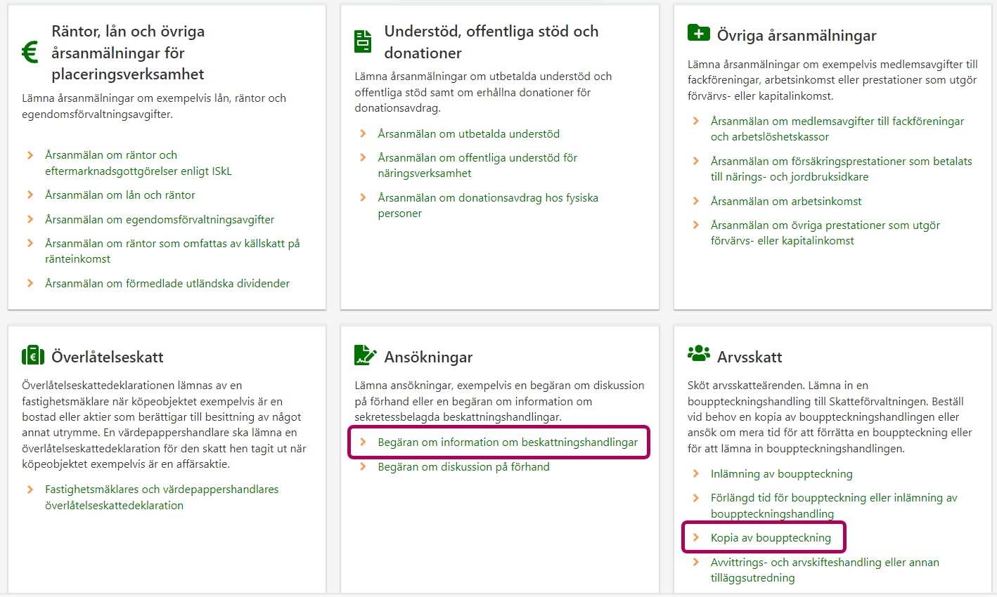 - Om du ber om någon annan persons eller något annat företags handling ska du i punkten Ansökningar välja länken Begäran om information om beskattningshandlingar.