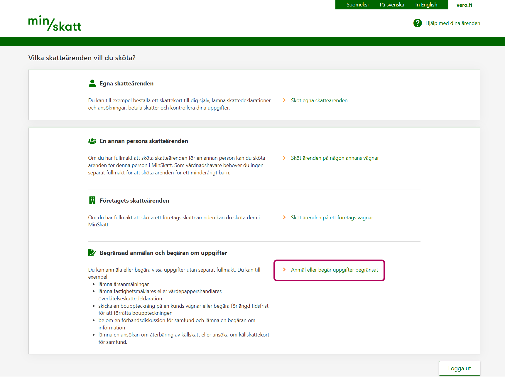 Om du behöver så gamla beskattningsuppgifter att de inte finns i MinSkatt, ska du välja Jag beställer egna beskattningshandlingar eller som fullmaktsinnehavare en annan persons beskattningshandlingar. Välj också denna punkt om du exempelvis av din släkting fått fullmakt att be om dennes beskattningsuppgifter eller om ditt företag av en kund fått fullmakt att be om kundens beskattningsuppgifter.