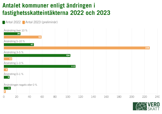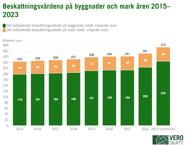 Fastighetsskatteintäkterna stiger med cirka 170 miljoner euro (+8,2 procent) från i fjol. Den kraftiga ökningen beror på ökningen i byggnadskostnadsindexet som lett till en ökning i återanskaffningsvärdet på byggnader med 9,4 procent. Ökningen i byggnadskostnadsindexet är större än någonsin tidigare i fastighetsbeskattningens historia. Fastighetsskatten ökar emellertid inte i rekordtakt eftersom den utöver byggnadernas återanskaffningsvärden även påverkas av ändringar till exempel i olika markers beskattningsvärden samt i fastighetsskattesatserna. Fastighetsskattens belopp har senast år 2014 ökat snabbare än år 2023.