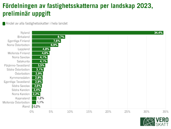 Enligt preliminära uppgifter är de Nyländska kommunernas andel 34,4 procent av den kalkylerade fastighetsskatten i hela landet. De näst största andelarna har kommunerna i Birkaland (8,7 %) och Egentliga Finland (7,6 %). Jämfört med fjolåret minskar Nylands andel med 0,6 procentenheter medan Norra Österbottens andel ökar med 0,3 procentenheter.