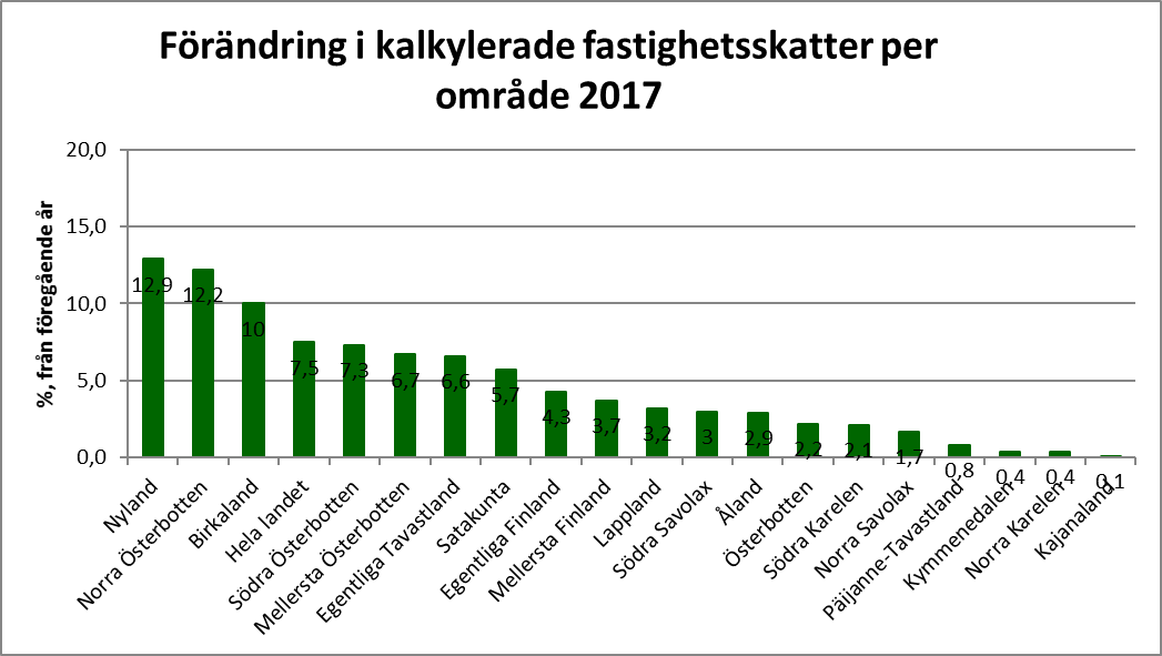 När man granskar uppgifterna per landskap ser man att fastighetsskatteintäkterna ökar mest på Nyland, +12,9 procent. Enligt de preliminära uppgifterna överstiger också fastighetsskatteintäkterna i Norra Österbotten (+12,2 %) och Birkaland (+10,0 %) tillväxtprocenten i hela landet (+7,5 %). Fastighetsskatteintäkterna ökar mest långsamt i Kymmenedalen (+0,4 %), Norra Karelen (+0,4 %) och Kajanaland (+0,1 %).