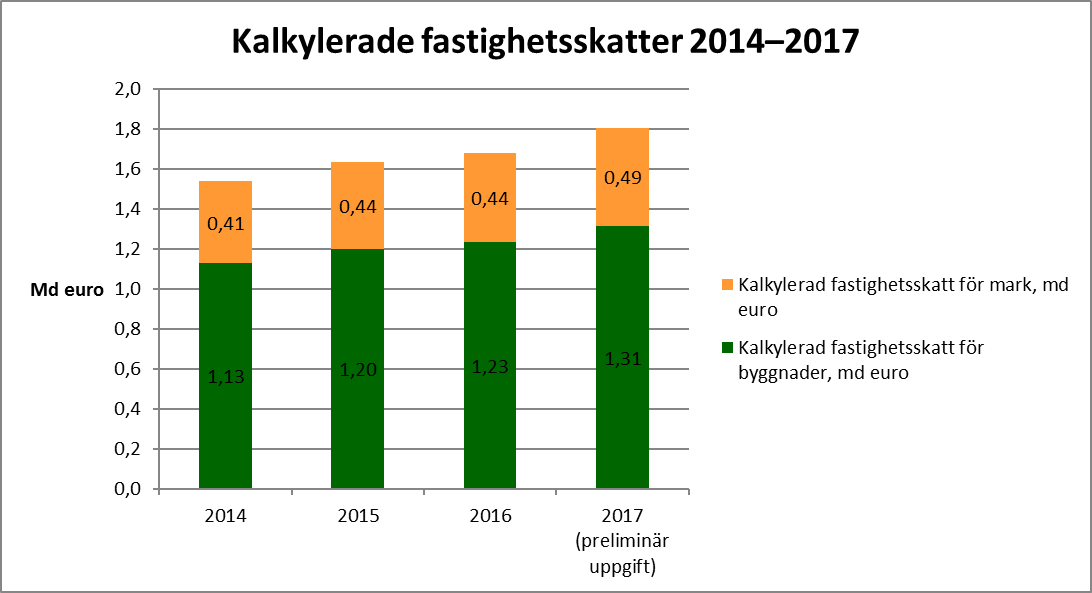 Enligt de preliminära uppgifterna ger fastighetsskatteintäkterna år 2017 kommunerna 1,8 miljarder euro. Det är 126 miljoner euro (+7,5 %) mer än den fastighetsskatt som debiterats år 2016. Fastighetsskatten som tog ut år 2016 ökade med 2,9 procent. Den fastighetsskatt som i år flyter in från marker ökar enligt de preliminära uppgifterna med 10,3 procent och den som flyter in från byggnader med 6,5 procent. Cirka 80 procent av fastighetsskatteintäkterna flyter in från byggnader.
