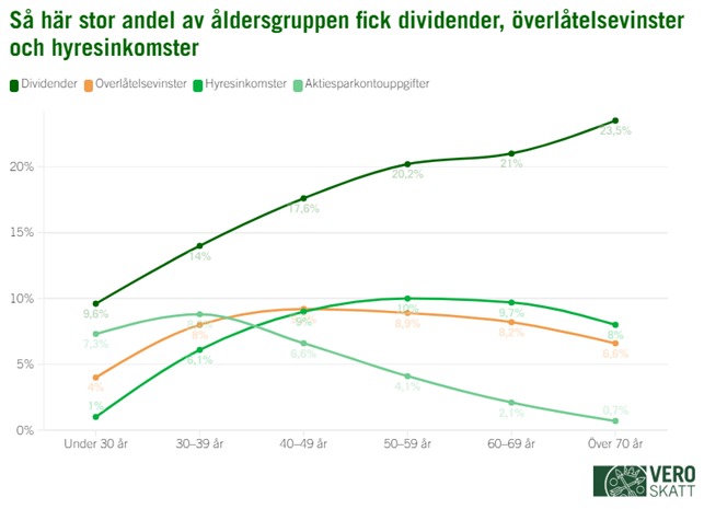 40–49-åringarna förtjänade mest av åldersgrupperna, sammanlagt 36,5 miljarder, av vilket andelen löneinkomster var 29,5 miljarder (81 %). Även medelvärdet och medianen av inkomsterna i gruppen 40–49-åringar. Mängden kapitalinkomster fördelades rätt så jämnt på alla åldersgrupper över 40 år.