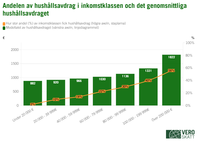 Hos de skattskyldiga som tjänade över 200 000 euro fick 56 procent hushållsavdrag. Medelvärdet på avdraget för dem var 1 822 euro. På motsvarande sätt fick till exempel 14 procent av de skattskyldiga som förtjänade 40–60 tusen euro hushållsavdrag. Medelvärdet på avdraget för dem var 966 euro.