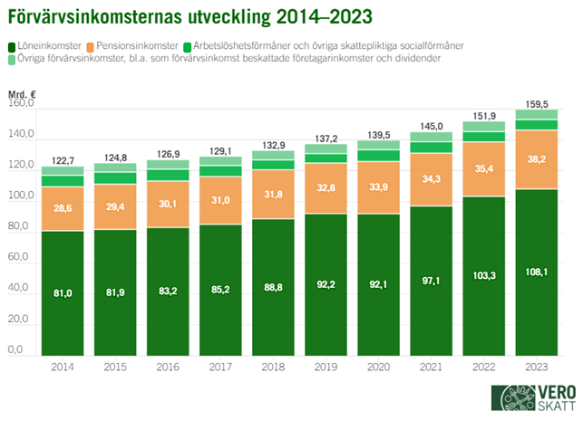 Förvärvsinkomsternas och inkomstskatternas positiva utveckling förklaras i synnerhet av det förbättrade sysselsättningsläget och den stora indexjusteringen av pensionerna. År 2023 ökade löneinkomsterna med sammanlagt 4,8 miljarder till 108,1 miljarder (+4,7 %). År 2023 översteg antalet personer som fick löneinkomster för första gången 3 miljoner (3 005 232), vilket var 24 tusen fler än år 2022 (+0,8 %). Antalet omfattar alla som överhuvudtaget har fått löneinkomster under kalenderåret 2023. I och med det förbättrade sysselsättningsläget minskade antalet personer som fått arbetslöshetsförmåner med 11 tusen personer (-2,0 %) till sammanlagt 541 tusen personer. Arbetslöshetsförmånernas belopp i euro var knappt 3,8 miljarder år 2023, vilket var 131 miljoner mer (+3,6 %) än år 2022.