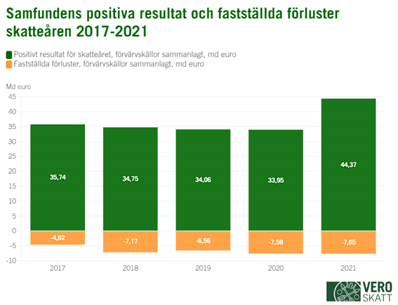 Förluster har fastställts för sammanlagt cirka 102 800 samfund (+4,2 %) för skatteåret 2021. Det totala beloppet av fastställda förluster från alla förvärvskällor sammanlagt var cirka 7,7 miljarder euro. De fastställda förlusterna ökade med 1 procent jämfört med året innan. Den genomsnittliga fastställda förlusten var cirka 74 500 euro och medianen 3 886 euro.