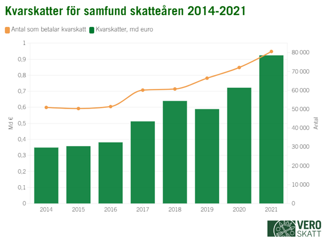 Kvarskatt förföll till betalning för 80 583 samfund (+11,8 %) till ett belopp på totalt 924,1 miljoner euro (+28,0 %). Den genomsnittliga kvarskatten uppgick till 11 468 euro och medianen för kvarskatterna var 1 628 euro. Cirka 563 miljoner euro av det totala beloppet kvarskatter bestod av kvarskatter på över 50 000 euro.