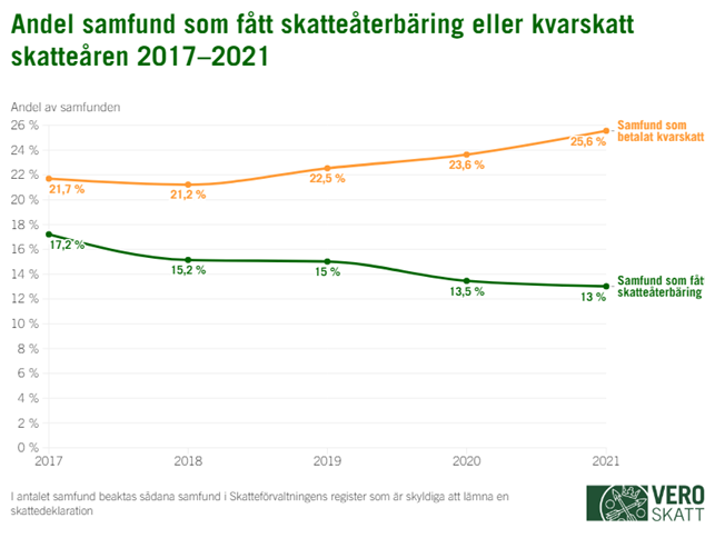 Andelen samfund som har fått skatteåterbäring har minskat under de senaste åren och år 2021 fick 13 procent av denna typ av samfund skatteåterbäring. Andelen samfund som har betalat kvarskatt har däremot ökat i flera års tid. År 2021 påfördes kvarskatt för 25,6 procent av samfunden. Den stora mängden kvarskatter vittnar om att en del av samfunden hade sänkt förskottsskatterna för skatteåret 2021 för mycket, vilket ledde till att det förföll mer kvarskatt till betalning än normalt
