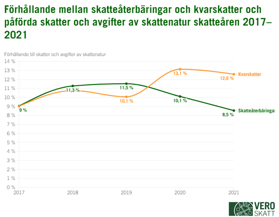 Förhållandet mellan skatteåterbäringar och kvarskatter och de skatter och avgifter av skattenatur som påförts samfund har varierat relativt mycket på årsnivå. År 2021 var relationstalet mellan skatteåterbäringar och skatter 8,5 procent. Kvarskatternas andel av skatterna och avgifterna av skattenatur var 12,6 procent.
