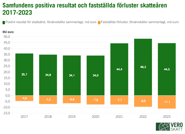 Förluster har fastställts för sammanlagt cirka 116 800 samfund (+4,6 %) %) för skatteåret 2023. Det totala beloppet av fastställda förluster från alla förvärvskällor sammanlagt var cirka 11,1 miljarder euro. De fastställda förlusterna ökade med 16,2 procent jämfört med året innan. Den genomsnittliga fastställda förlusten var cirka 94 855 euro och medianen 4 459 euro.