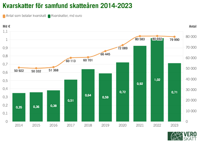 Kvarskatt förföll till betalning för 79 990 samfund (-0,9 %) till ett belopp på totalt 713 miljoner euro (-30,0 %). Den genomsnittliga kvarskatten var 8 912 euro och medianen för kvarskatterna var 1 319 euro. Cirka 389 miljoner euro av det totala beloppet kvarskatter bestod av kvarskatter på över 50 000 euro. Det minskade kvarskattebeloppet visar att förskottsskatten för 2023 i många samfund har varit närmare samfundsskattebeloppet i den slutförda beskattningen än året innan. Detta har gjort att kvarskatten har blivit mindre än föregående år.